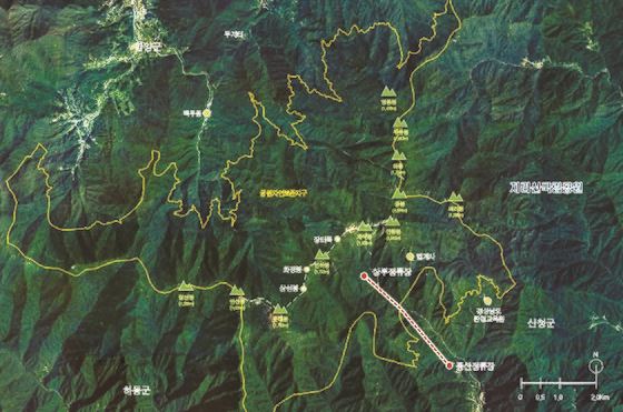 경남 산청군이 지난 6월 환경부에 제출한 ‘산청 지리산 케이블카’ 노선도. 중산리~장터목 인근 3.15㎞ 구간에 8인승 케빈 53대를 운영할 계획이다. 산청군 제공