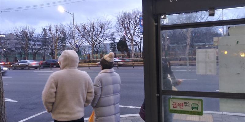 기온이 급강화한 21일 저녁 서울 강서구의 한 버스 정류장에서 완전 무장을 한채 버스를 기다리고 있다. 정기홍 기자