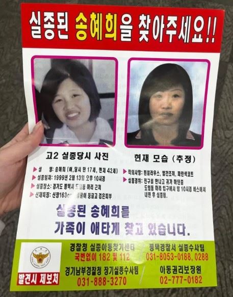 지난 26일 교통사고로 세상을 떠난 송길용 씨가 지난 1999년 실종된 둘째 딸 송혜희 씨를 찾기 위해 25년간 시민들에게 나눠주었던 '실종된 송혜희를 찾아주세요' 전단. SNS