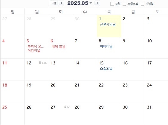 5월 초순 휴일은 '근로자의날'(1일)을 시작으로 주말(3, 4일), '부처님오신날' 겸 '어린이날'(5일), 대체공휴일 (6일) 등이다.