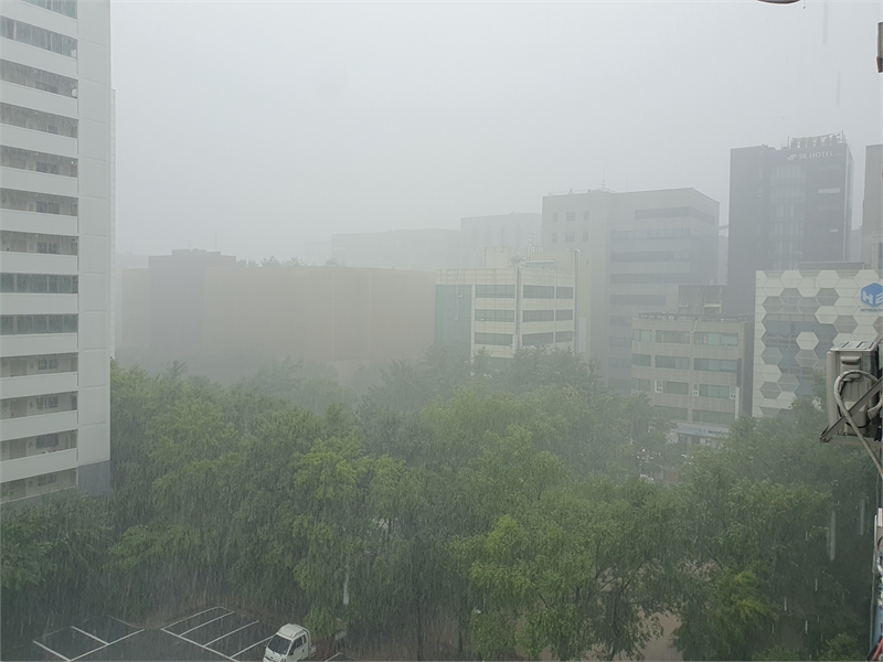 서울 강서구 지하철 5호선 인근 NC백화점 인근 하늘. 주위가 갑자기 어두워지면서 엄청난 비가 쏟아지고 있다.
