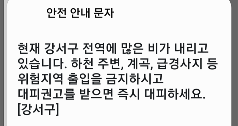 기상청은 13일 오전 11시 39분을 기해 서울 강서구 가양1동 인근에 시간당 50mm의 극한호우가 쏟아지고 있다며 하천 주변, 지하차도 등 저지대 접근을 하지 말 것을 당부했다.