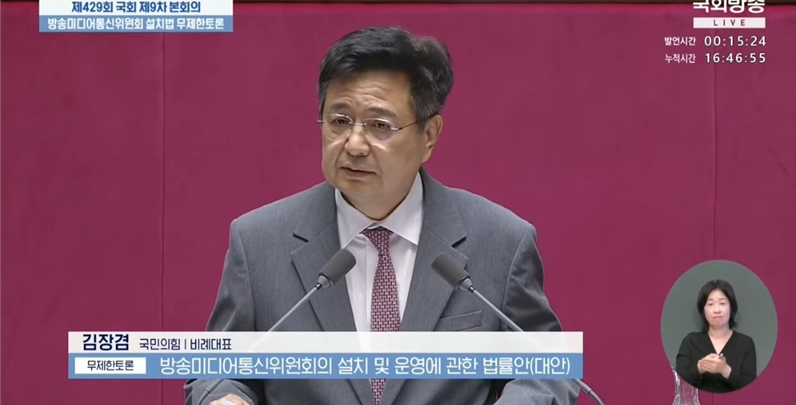 필리버스터에 나선 김장겸 국민의힘 의원은 “겉으로는 거버넌스 개편을 내세우지만 실제는 현직 이진숙 방통위원장 배제를 겨냥한 표적 입법”이라며 “임기 보장이라는 헌법적 안전핀을 무력화해서 유일한 정무직인 이진숙 위원장을 끌어내리겠다는 것”이라고 강하게 비판했다.