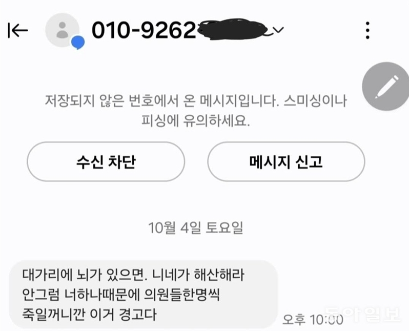 국민의힘 김미애 의원에게 보낸 협박 문자 메시지 내용