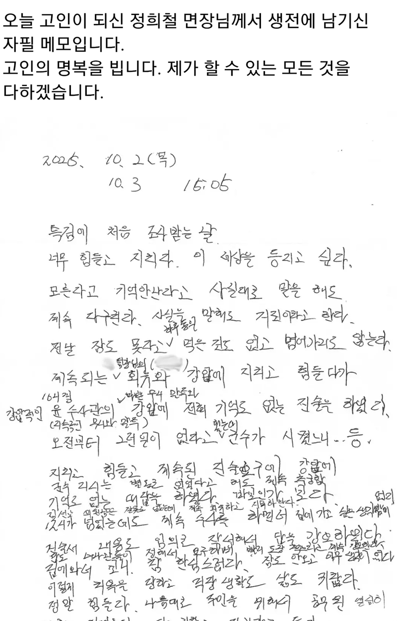 A 씨가 생전 작성한 자필 메모에는 “계속되는 (특검 측) 회유와 강압에 지치고 힘들다”는 내용이 담겼다.