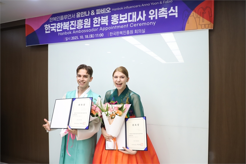 한국한복진흥원(경북 상주시 함창읍, 원장 박후근)은 지난 18일 진흥원 외국인 홍보대사로 독일 출신 배우 윤안나(독일명 Anna Rihlmann) 씨와 스페인 출신 크리에이터인 파비오 브라이스(스페인명 Fabio Brais Gonzalez Prieto) 씨를 위촉했다고 22일 밝혔다.
