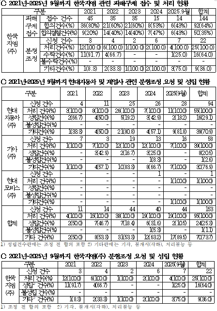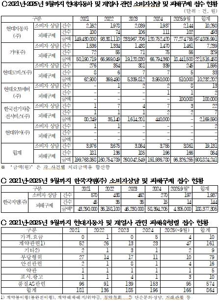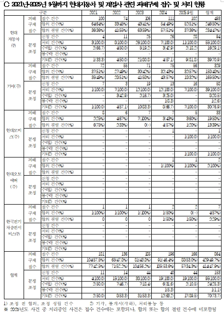 뿐만아니라 실제 피해구제를 받기 위한 접수 규모 역시 상당한 수준이었다. 지난 5년여 기간(2021년~2025년 9월) 동안 현대자동차와 자동차 분야 계열사에 대한 피해구제 건수는 864건에 피해구제 금액은 9억 882만원에 달하였다.