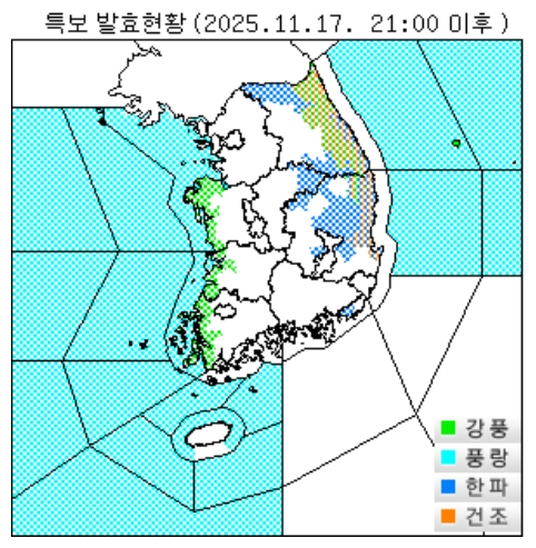 충청과 전라 해안 지역은 강풍특보가 내려져 18일 오전까지 시속 90㎞의 태풍급 강풍이 불고 비나 눈이 내릴 전망이다. 광주 등 전라 일부 지역에는 1㎝ 안팎의 첫눈이 내릴 가능성도 있다.
