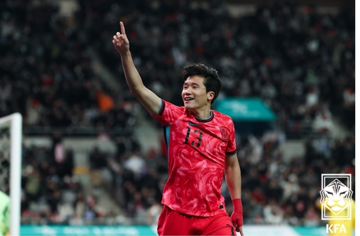 가나전에서 결승골을 터뜨린 이태석이 손을 들어 세리머니를 하고 있다. KFA