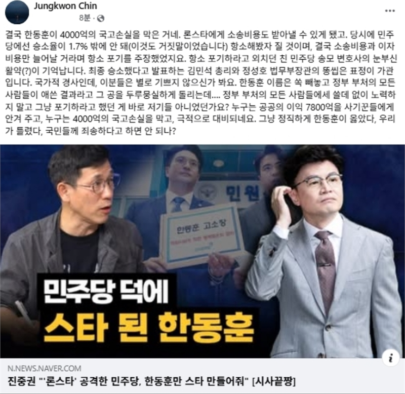 진 교수는 이날 페이스북 글에서 "결국 한동훈이 4000억의 국고손실을 막은 것"이라고 했다.