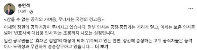 이어 “일선 공무원들은 ‘휴대폰 검열’의 대상이 되어 위축되고 있는 반면, 정권에 충성하는 고위 공직자들은 능력이나 도덕성과 무관하게 승승장구하고 있다”고 주장했다.