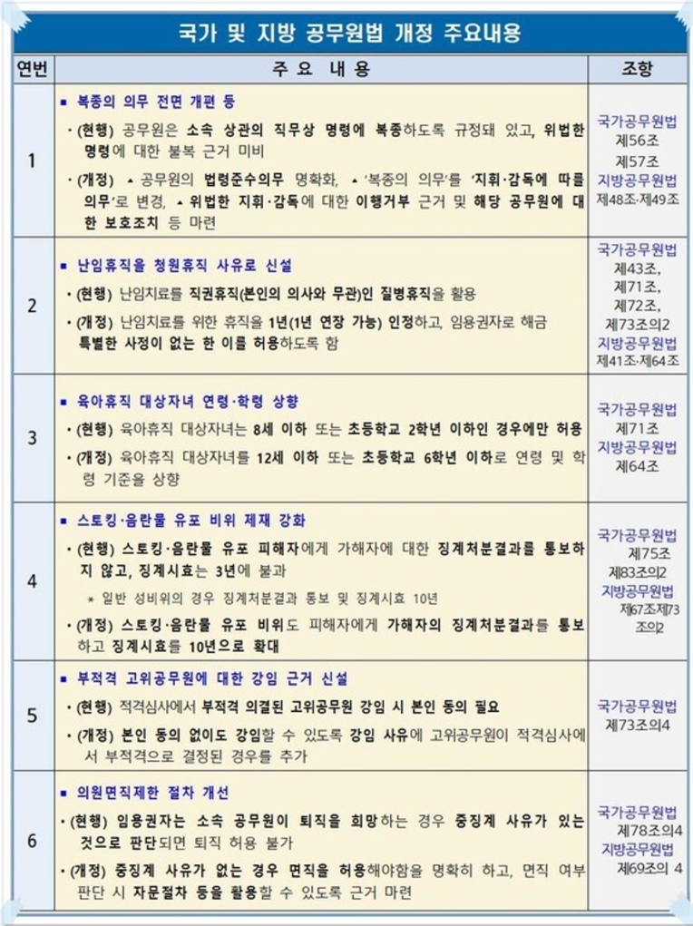 주요 변경 내용은 ▲'공무원은 구체적 직무 수행과 관련한 (상관의) 지휘·감독에 대하여 의견을 제시할 수 있다' ▲'공무원은 소속 상관의 지휘·감독이 위법하다고 판단할 만한 상당한 이유가 있으면 이에 따르지 아니할 수 있다 ▲'누구든지 (공무원의 의견 제시나 위법한 지휘·감독 이행 거부를 이유로) 공무원에게 불이익 처분이나 대우를 해서는 아니 된다'는 등이다.