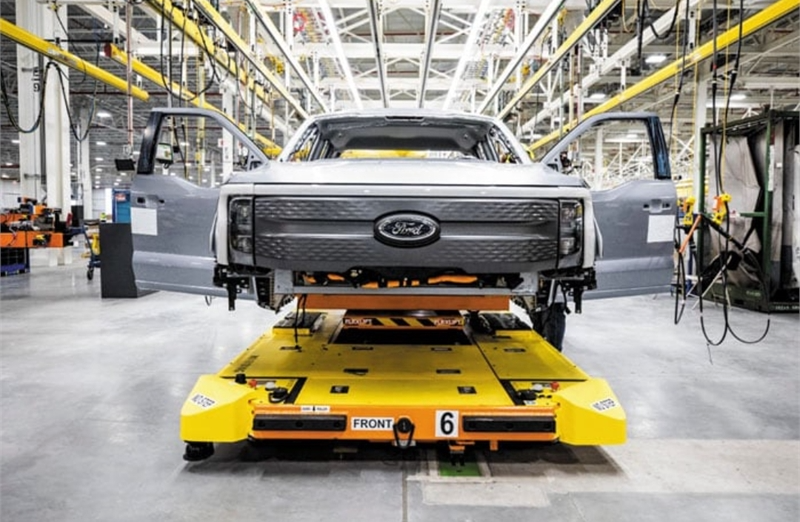 미국 미시간주에 있는 포드의 전기차 전용 생산 라인에서 전기 픽업트럭 ‘F-150 라이트닝’이 조립되고 있다. 포드