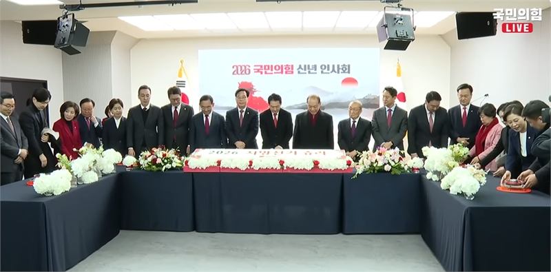1일 서울 여의도 당사에서 열린 2026 국민의힘 신년인사회에서 떡을 자르기 앞서 기념 촬영을 하고 있다. 국민의힘TV