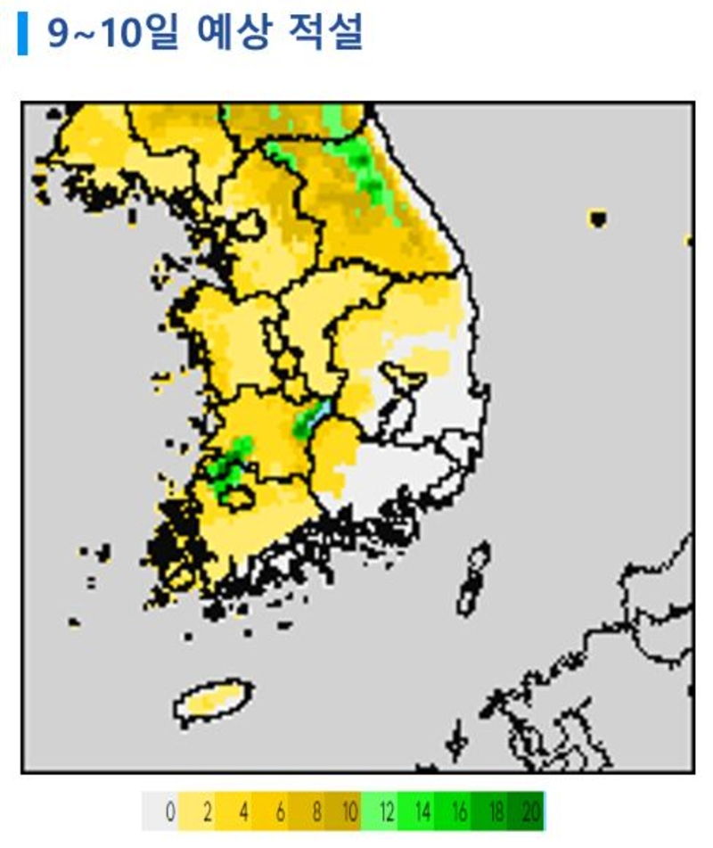 9~10일 예상 적설량은 ▲경기 동부 3~8㎝ ▲경기 서부, 서해 5도 1~5㎝ ▲서울·인천 1~3㎝ ▲강원도 3~15㎝ ▲충청권 1~5㎝ ▲호남권 2~7㎝ ▲영남권 1~5㎝ ▲제주도 1~5㎝로 예보됐다.