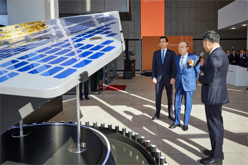 김승연 한화그룹 회장(가운데)과 김동관 부회장이 지난 8일 한화시스템 제주우주센터를 방문, 세계 최고 수준인 해상도 15cm급 VLEO UHR SAR 위성 실물모형 앞에서 설명을 듣고 있다. 한화그룹