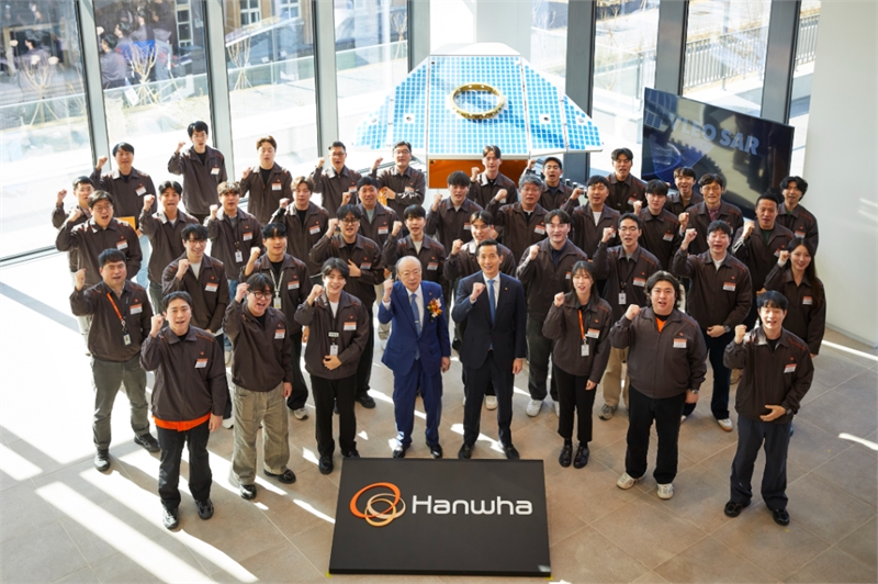 한화그룹 김승연 회장과 김동관 부회장이 한화시스템 제주우주센터 임직원들과 VLEO UHR SAR 위성 실물모형 앞에서 기념사진을 찍고 있다. 한화그룹