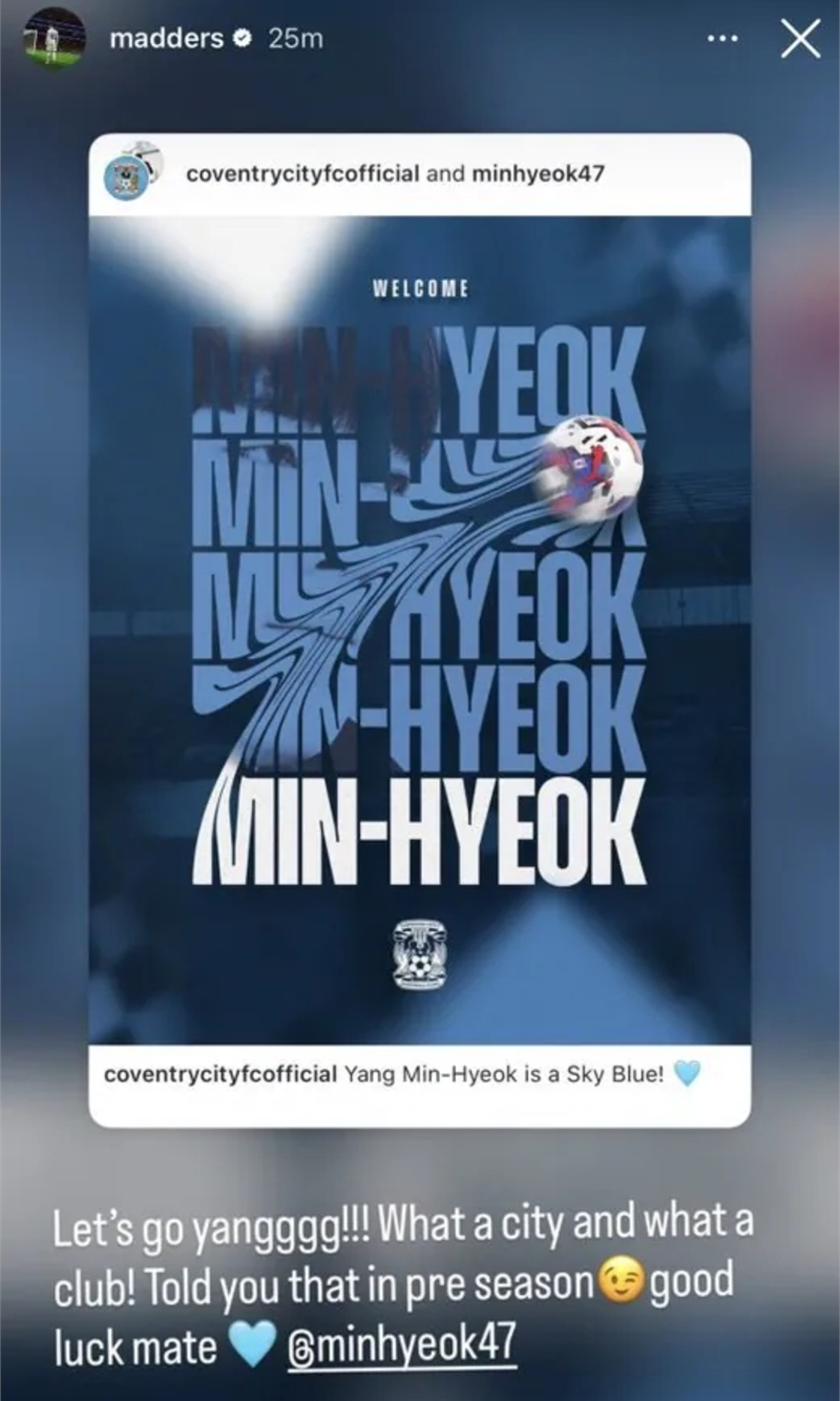 매디슨은 자신의 SNS를 통해 양민혁의 코번트리행을 전하며 "양민혁 가자! 코번트리는 정말 위대한 도시고 멋진 구단이다. 이미 프리시즌에 내가 말했던 대로다. 행운을 빈다"며 지지를 보냈다.