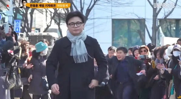 한동훈 전 국민의힘 대표가 지난해 12월 3일 '12.3 계엄 1년'을 맞아 서울 여의도에서 열린 집회장으로 들어서고 있다. 유튜브 '언더73스튜디오'