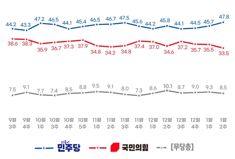 리얼미터가 에너지경제신문 의뢰로 지난 8~9일 18세 이상 유권자 1006명을 대상으로 한 정당 지지율 조사에서 국민의힘은 2.0%포인트(p) 하락한 33.5%에 머물렀다. 반면 더불어민주당은 전주보다 2.1%p 상승한 47.8%를 기록했다.