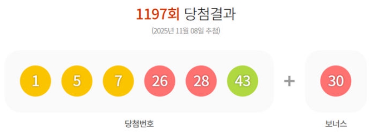 로또복권 운영사인 동행복권은 8일 추첨한 제1197회 동행복권에서 '1, 5, 7, 26, 28, 43'이 1등 당첨 번호로 결정됐다고 밝혔다. 2등 보너스 번호는 '30'이다.6개 번호를 모두 맞힌 1등 당첨자는 13명이다. 각각 22억 508만 9827원(세전)을 받는다. 5개 번호와 보너스 번호를 맞힌 2등은 74명