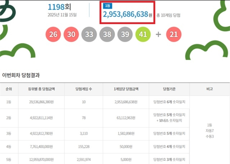 15일 추첨 제1198회 로또 1등 10명, 29억 원 횡재
