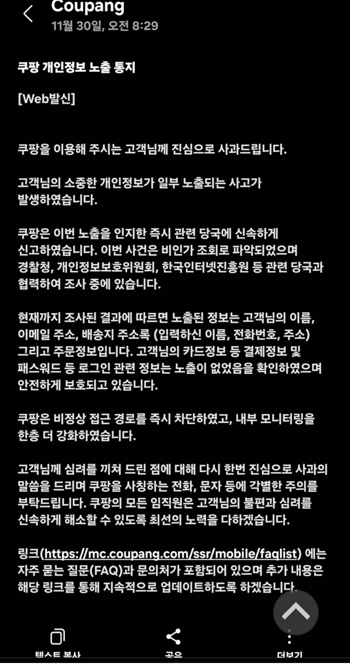 "유출로 공지했습니다"···쿠팡, 7일 '꼼수 노출'을 유출로 바꿔 재공지