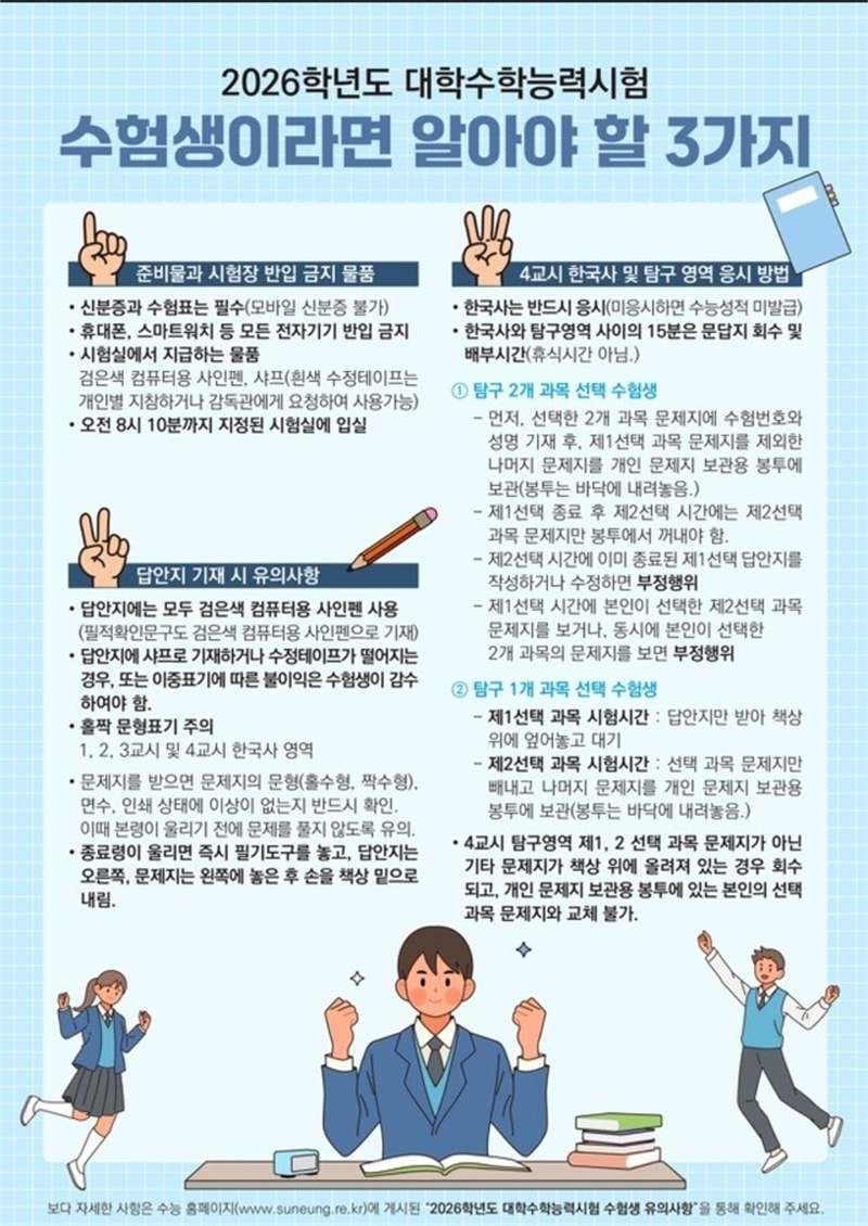 13일 2026학년도 대학수학능력시험이 전국 고사장에서 일제히 치러진다.수험생들이 사전에 챙겨야 할 주의 사항을 알아본다. 수험생들은 시험 전날인 12일 예비 소집일에 참석해 수험표를 받고, 시험일에 차분하게 시험에 임할 수 있도록 시험장 위치와 유의 사항을 점검해야 한다. 시험을 치를 교실을 먼저 들러보면 시험일 안정감