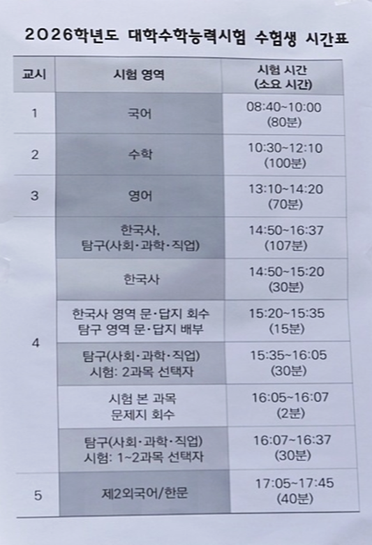 2026학년도 대학수학능력시험(수능)이 치러지는 13일 출근 시간이 한 시간 늦춰진다. 주식시장도 마찬가지로 한 시간 뒤에 개장된다. 시험장 주변 소음 방지 대책도 마련됐다.올해 수능은 이날 오전 8시 40분부터 오후 5시 45분(일반수험생 기준)까지 전국 1310개 시험장에서 치러진다. 응시자는 전년보다 3만1504명