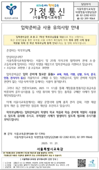 서울시교육청이 모든 초중고 학생 가정에 '입학준비금' 사용 주의사항을 담은 가정통신문을 보냈다. 입학준비금으로 명품 지갑과, 게임기 등 부적절 사용 사례가 언론(KBS)을 통해 드러난 데에 따른 조치다.입학준비금은 신입생 학부모들의 학습 준비 부담을 줄이기 위해 주는 돈이다. 서울 기준으로 초등학생은 20만 원, 중·고