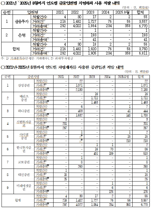 5년여간 금융업권 임직원 차명계좌 거래 3750건에 투자원금 68억···고발 없고 73% 경징계에 그쳐