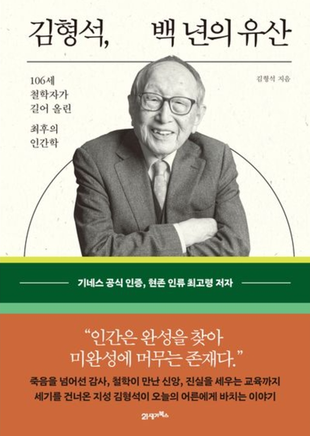 “사람은 ‘이젠 내가 늙었구나’라고 생각할 때 늙습니다. 정신은 늙지 않아요” ‘세계 최고령 저자’ 김형석(105) 연세대 철학과 명예교수가 지난 12일 신간 ‘김형석, 백년의 유산’ 출판 기념에서 한 말이다. 김 교수는 1920년 4월생이다.그는 이날 서울 중구의 한 식당에서 열린 출판 간담회에서 “살아 보니 100세