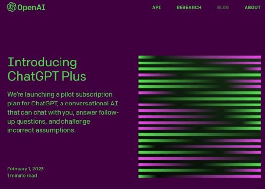 오픈AI는 폭발적인 이용자 증가에 힘입어 지난 10일 월 20달러 이용료를 받은 유료 서비스인 '챗GPT 플러스(ChatGPT PLUS)'를 출시했다.