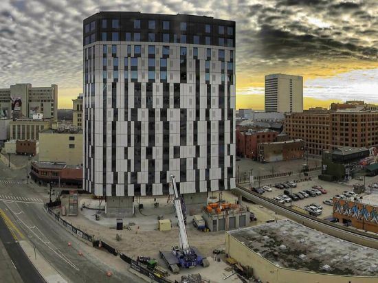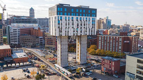 시공사인 호주의 바튼 맬로(Barton malow)에 따르면, 미국 미시간주 디트로이트 시에 있는 16층(63m)의 '익스체인지 타워'는 지난해 5월 453t의 지붕을 올린 뒤 아래로 하나씩 층을 채워가는 하향식 공법(Top-down)을 활용해 건물 외관을 완성했다. '리프트빌드(Liftbuild)'공법이라고도 한다.
