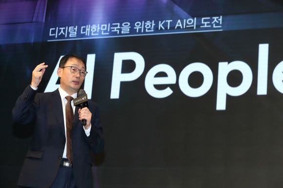 소피텔 앰배서더 서울 그랜드볼룸에서 열린 KT AI 전략 발표 간담회에서 구현모 KT 대표가 AI 발전전략을 발표하고 있다. KT 제공