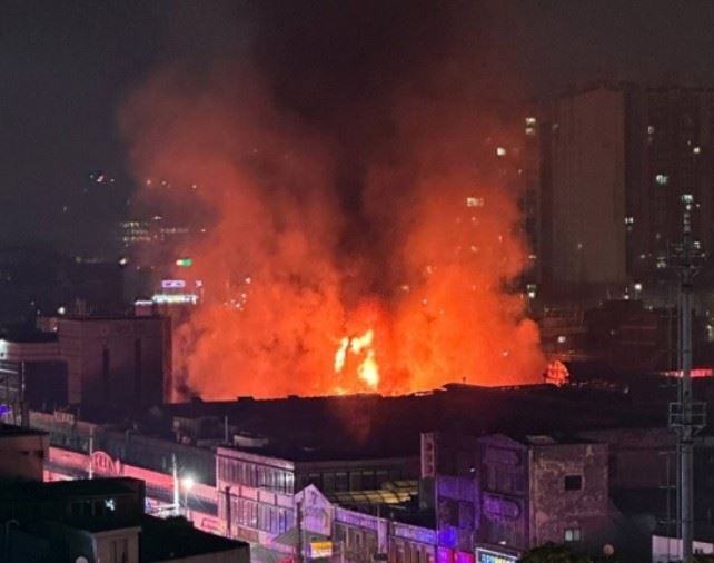 4일 오후 11시 38분쯤 인천시 동구 송림동 현대시장에서 큰불이 나 화염이 치솟고 있다. 독자 제공