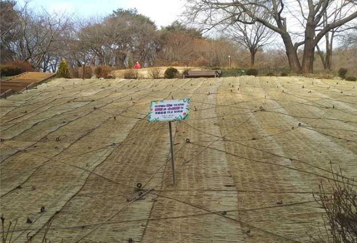 서울 서대문구 안산 자락에 봄꽃 씨를 뿌려 볏짚으로 덮어놓은 모습. 한 주민이 춘삼월을 기다리는 듯 망중한을 즐기고 있다. 정기홍 기자