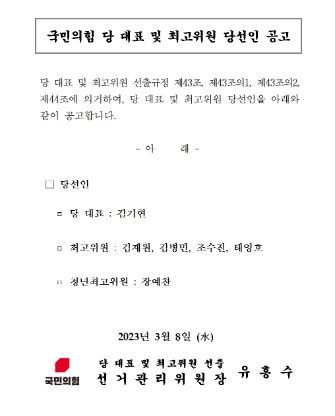 최고위원으로는 김재원 전 의원, 김병민 전 비상대책위원과 조수진 의원, 태영호 의원이 당선됐고, 청년 최고위원으로는 장예찬 후보가 당선됐다.