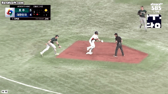 강백호가 9일 호주와의 WBC 1라운드 B조 1차전 7회말 1사 주자 없는 상황에서 대타로 나와 2루타를 친 뒤 세리머니를 하다가 베이스에서 발을 떼 태그아웃을 당하고 있다. SBS 중계방송 캡처