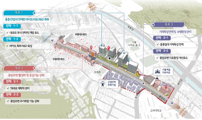 주요 내용으로는 대규모 부지를 활용한 신설 역세권(동북선 105정거장) 활성화할 계획이다. 바이오·의료 R&D 연구를 위한 업무지원 및 벤처기업 유도를 위해 용도지역 상향이 포함된 특별계획구역 및 용도지역 조정가능지 제도를 도입해 복합개발을 유도할 방침이다.또 종암로변 개발 활성화를 위해 판매 및 업무시설에 대한 용도 완화를 계획했다.