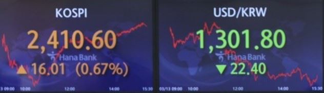 주말에 터진 미국 실리콘밸리은행(SVB) 파산의 여파에도 불구 국내 주식시장은 상승 마감했다. 향후 미국의 금리 인상에 제동이 걸릴 가능성이 부각되면서 달러-원은 급락했고 국채선물은 급등했다.