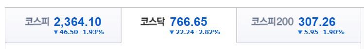 14일 낮 12시 40분 현재 국내 주식시장은 코스피는 1.93%(-46.5) 내려 2364.10, 코스닥은 2,94%(-22.24) 폭락해 766.65를 기록 중이다.