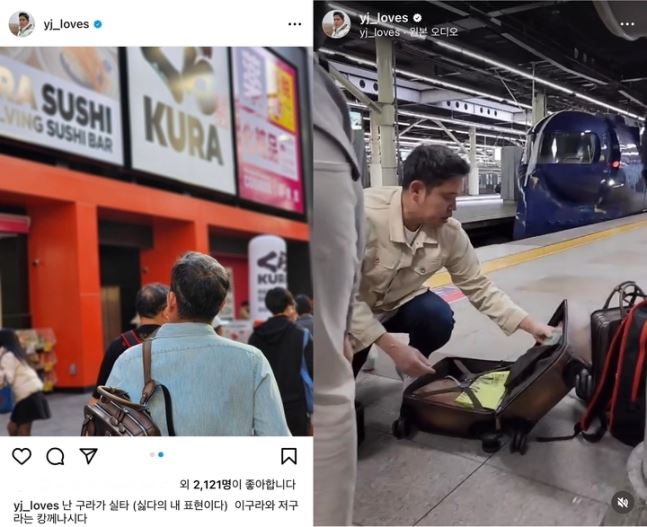 14일 정 부회장은 일본 오사카 '쿠라스시'를 배경으로 배낭을 멘 자신의 뒷모습이 담긴 사진을 게재했다. 이어 일본 현지 열차 플랫폼 내에서 쪼그리고 앉아 직접 '과자'를 캐리어에 옮기는 짧은 영상도 올렸다.