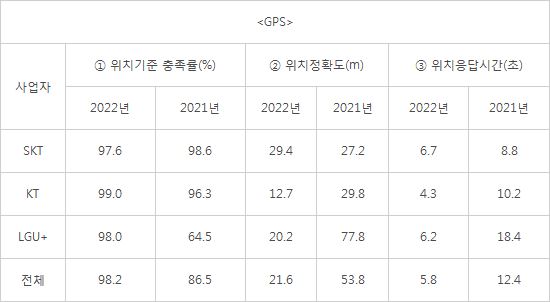 GPS 방식 위치기준 충족률은 KT 99%, LG유플러스 98%, SK텔레콤 97.6% 순이었다.