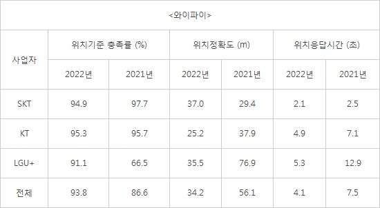 와이파이 방식 측정 결과 위치기준 충족률은 KT 95.3%, SK텔레콤 94.9%, LG유플러스 91.1%, 위치정확도는 KT 25.2m, LG유플러스 35.5m, SK텔레콤 37m을 각각 기록했다.