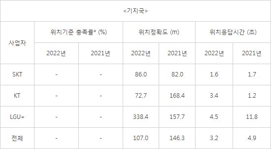 기지국은 기술방식 특성상 거리오차 범위가 50m 이상이어서 측정이 어려워 위치정보 충족률 측정에서 제외됐고, 거리오차와 응답 시간만 측정됐다.