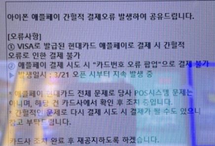 편의점에서 공개한 비자 현대카드로 애플페이 결제 시 간헐적 오류가 나타난다는 애플 측의 안내문. 온라인커뮤니티 캡처