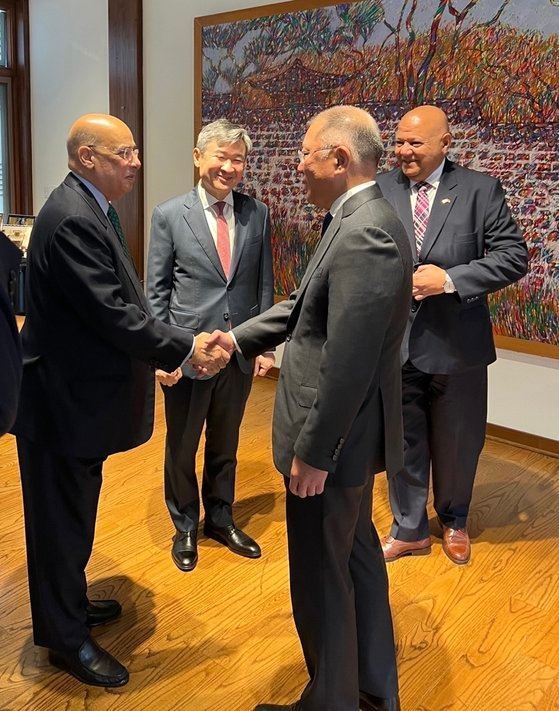 정의선 현대차그룹 회장(오른쪽 둘째)이 지난 2월 말 미국 워싱턴에서 열린 주미 한국대사관 행사에서 로날드 샌더스 앤티가바부다 대사와 악수하고 있다. 현대차그룹 제공