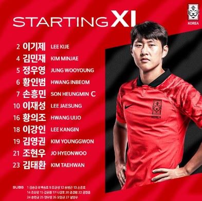 한국은 이전 콜롬비아전에서 교체로 나왔던 이강인(마요르카)을 미드필드로, 황의조(서울)를 공격수, 조현우(울산)를 골키퍼로 선발 투입했다.