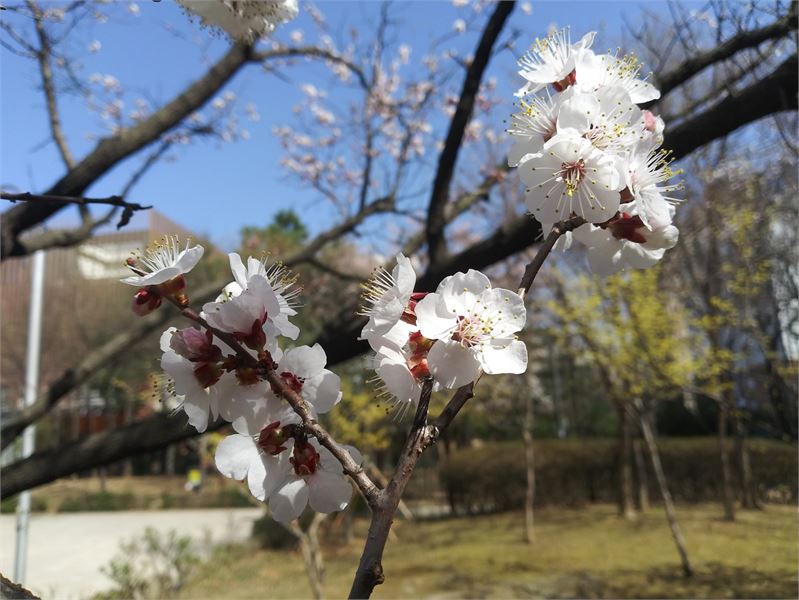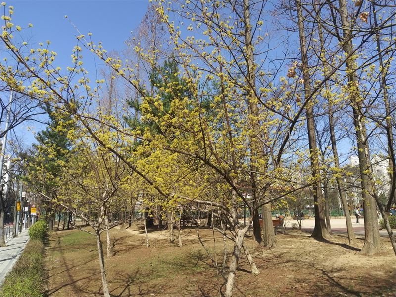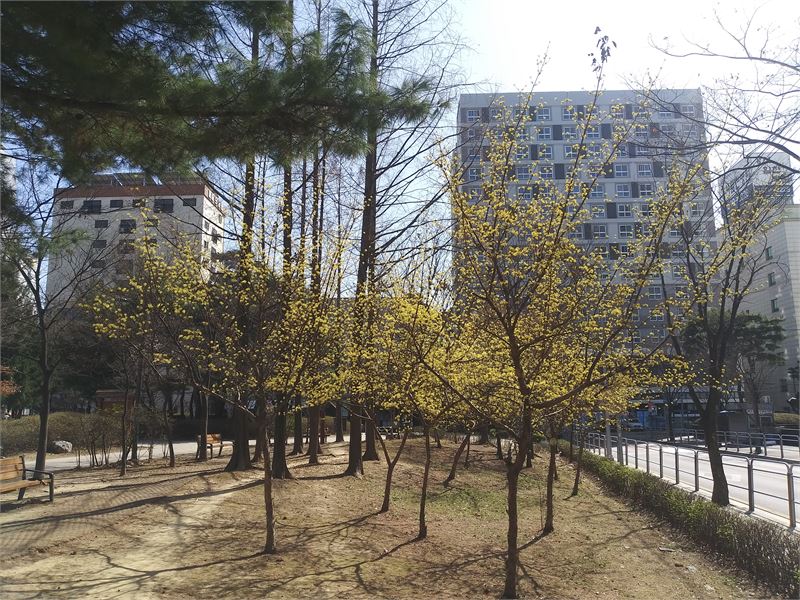 아직 겨울의 끝자락이 남은 듯한 공원. 산수유가 봄이 옴을 알리고 있다.